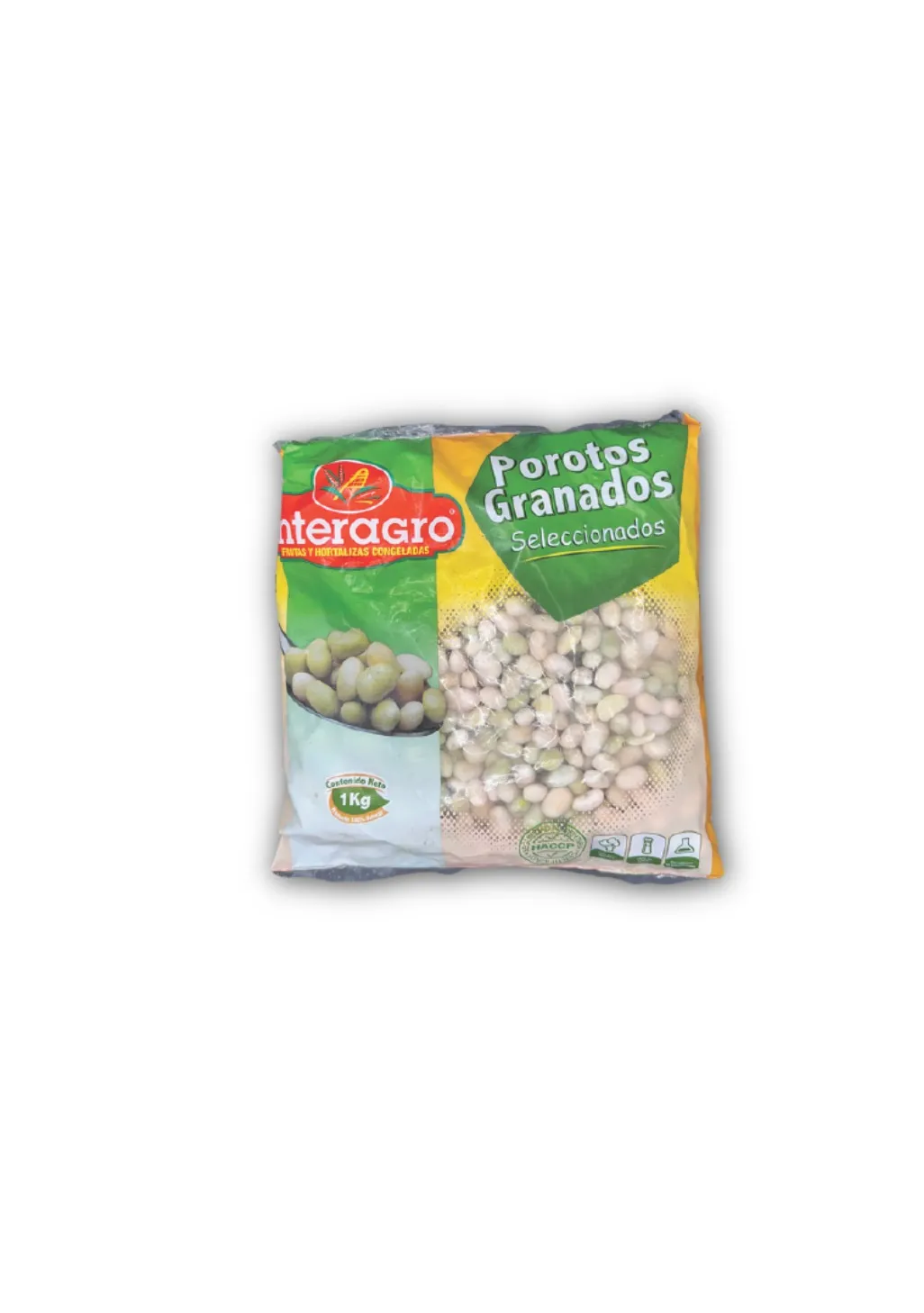 Porotos granados seleccionados, congelados en su punto justo de maduración para conservar sabor y textura. Se presentan en bolsas de 1 kg, con un total de 16 kg aprox. por caja.